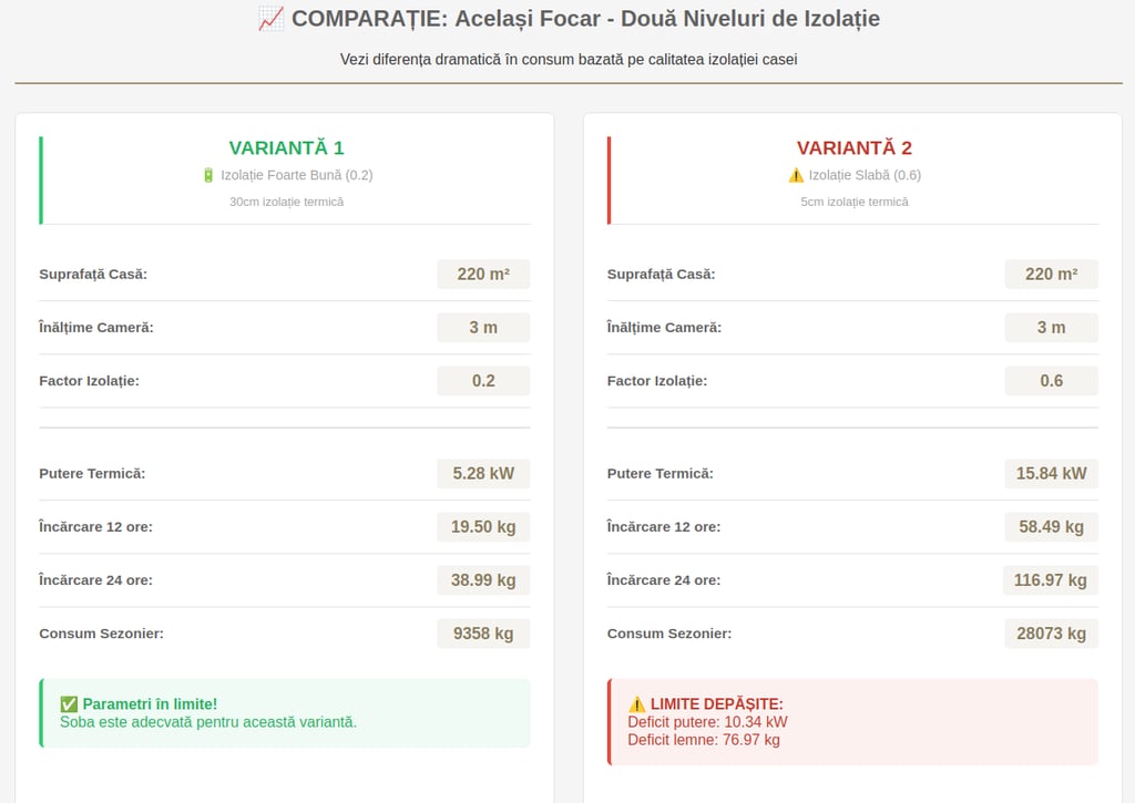 Concluzie: Investiția în izolație termică de calitate se amortizează rapid prin economiile la lemne. O diferență de 25cm la izolație poate reduce consumul de lemne cu peste 50%!